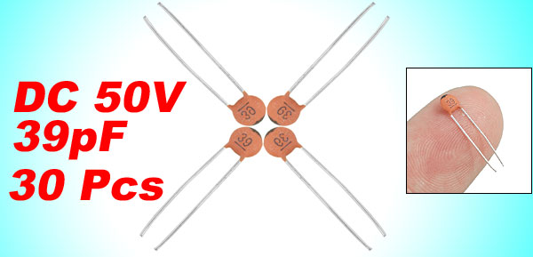 Product Name Ceramic Disc Capacitor Features Low Voltage Withstand Voltage DC 50V Capacitance 39pF Capacitance Tolerance ± 10% Lead Pitch Spacing 2.5mm / 0.1'' Body Dimension(Each) 3 x 1.5mm / 0.1" x 0.05"(D*T) Weight 2g Color As Picture Show Package Content 30 x Ceramic Disc Capacitors - Reviews