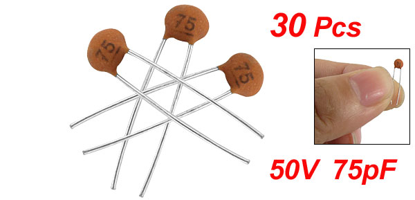 Product Name Ceramic Disc Capacitor Features Low Voltage Withstand Voltage DC 50V Capacitance 75pF Capacitance Tolerance ± 20% Lead Pitch Spacing 2mm/0.08'' Body Dimension(Each) 3 x 1.5mm / 0.1" x 0.05"(D*T) Weight 2g Color Brick Red Package Content 30 x Ceramic Disc Capacitors - Reviews