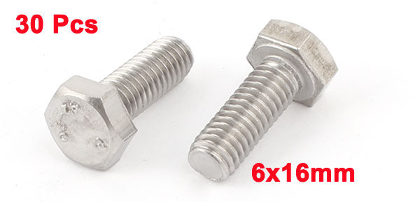 30 x Stainless Steel 304 A2-70 Hex Cap Screw Bolt Full Thread 6x16mm