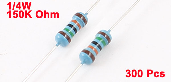 Product Name Metal Film Resistors Power Rating 1/4W Resistance 150K Ohm Tolerance ±1% Total Length(Approx.) 6.1cm /2.4" Body Size 2 x 5.5mm/0.08" x 0.24"(D*L) Color Blue, Brown, Black, Green Weight 37g Package Content 300(± 2%) x Metal Film Resistors - Reviews