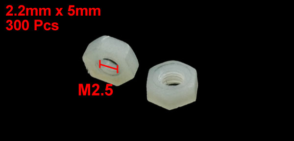 Product Name Hexagonal Threaded Spacer Thread Size M2.5 Total Size 2.2 x 5mm / 0.087" x 0.2" (H*D) Material Nylon Color White Net Weight 15g Package Content 300 Pcs (±2%) x Hexagonal Threaded Spacer - Reviews