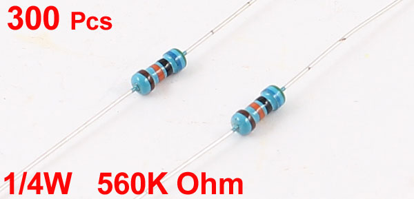 Product Name Metal Film Resistors Power Rating 1/4W Resistance 560K Ohm Tolerance ±1% Total Length(Approx.) 6.1cm /2.4" Body Size 2 x 5.5mm/0.08" x 0.24"(D*L) Color Blue, Brown, Black, Orange Weight 40g Package Content 300(± 2%) x Metal Film Resistors - Reviews
