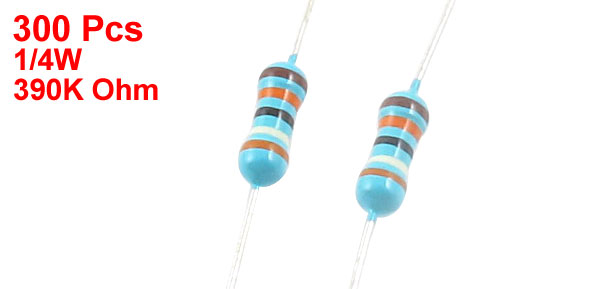 Product Name Metal Film Resistors Power Rating 1/4W Resistance 390K Ohm Tolerance ±1% Total Length(Approx.) 6.1cm /2.4" Body Size 2.2 x 5.5mm/0.09" x 0.24"(D*L) Color Blue, Brown, Black, White, Orange Weight 40g Package Content 300(± 2%) x Metal Film Resistors - Reviews