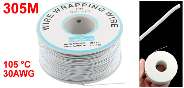 Product Name Wrapping Wire Model P/N B-30-1000 Type 30AWG Wire Size 0.5 x 0.25mm / 0.019" x 0.009"(OD*Wire Dia.) Cable Length(Approx.) 305M / 1000Ft Temperature Rating 105 °C Reel Size 7 x 3.3cm/ 2.7" x 1.3"(D*H) Material Plastic, PVC, Tin Plated Copper External Color White Weight 153g Package 1 x Wrapping Wire - Reviews