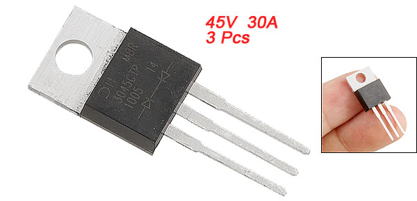 Product Name Dual Schottky Rectifiers Model No. MBR3045CT Drain Source Voltage 45V Drain Current 30A Mounting Hole Diameter 3.7mm/ 0.147" Pin Size 13 x 2.5mm/ 0.51" x 0.11" ( L* Pitch) Total Size 29 x 10 x 4.5mm/ 1.14" x 0.39" x 0.18" (L*W*H) Weight 6g Package 3 Pcs x Dual Schottky Rectifiers - Reviews