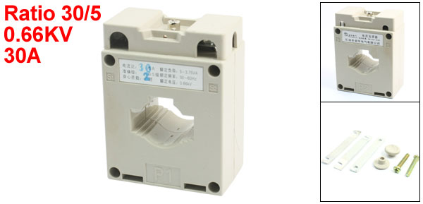 Item Name Current Transformer Model Number BH-0.66CT Rated Current Ratio 30/5 Accuracy Class 0.5 Rated Voltage 0.66KV Working Frenquency 50Hz - 60Hz Conductor Through 2T Primary Current 30A Secondary Load Capacity 5-3.75VA Opening Size 32 x 25mm/1.2" x 1“(L*W) Total Size 5 x 3.8 x 6cm/2" x 1.5" x 2.4"(L * W * H) Case Material Plastic Color Gray Weight 250g Package Content 1 x Current Transformer
