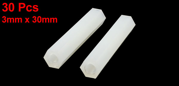 Product Name Hex Standoff Spacer Thread Size M3/3mm Female Width 5mm/0.2" Overall Size(Approx) 30 x 6mm /1.2" x 0.24" (L*Max.D) Material Nylon Color White Net Weight 24g Package Content 30 Pcs x Hex Standoff Spacer - Reviews