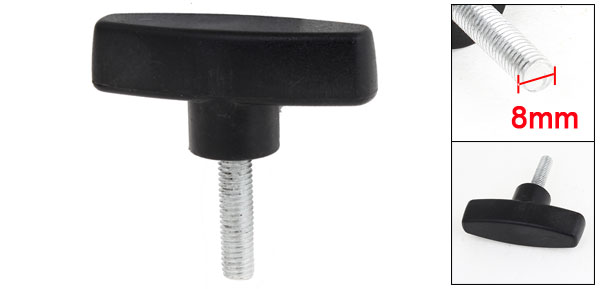 Product Name Handle Design T Shape Material Metal, Plastic Color Black Thread Diameter 8mm/ 5/16" Thread Length 30mm/ 1 2/11" Lever Length 65mm/ 25 1/2" Overall Size 65 x 59 x 20mm/ 2.6" x 2.3" x 0.8" (L*W*H) Net Weight 35g Package Content 1 x Machinery Handle - Reviews