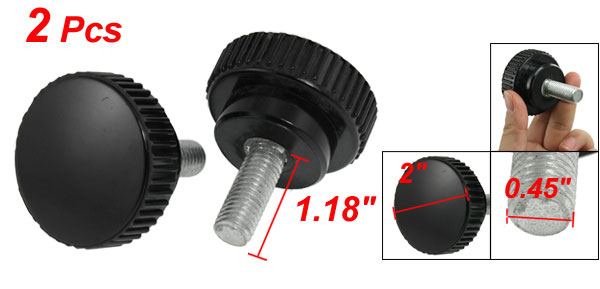 Product Name Knurled Knob Type Screw On Head Diameter 51mm / 2" Thread Length 30mm / 1.18" Thread Diameter 11.6mm / 0.45" Total Height 60mm / 2.4" Material Metal & Plastic Color Silver Tone & Black Weight 200g Package Content 2 x Knurled Knobs - Reviews