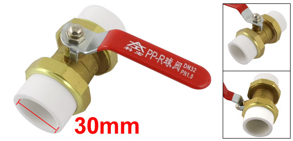 Product Name Ball Valve Type Full Port Handle Size 103 x 17 mm / 4.1" x 0.67" (L*W) Body Size 90 x 45 mm / 3.5" x 1.8" (L*W) Hole Inner Dia. 30mm / 1.2" Material Brass, PPR, Metal, Soft Plastic Color Gold Tone, Red, White Net Weight 268g Package Content 1 x Brass Ball Valve - Reviews