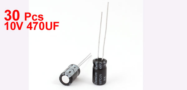 Product Name Electrolytic Capacitor Type Radial Voltage 10V Capacitance 470uf Body Size 6.3 x 11mm/0.25" x 0.43"(D*L) Lead Space 2.5mm/ 0.098" Lead Length 27mm/1.1", 22mm/0.9" Total Length 38mm/ 1.5" External Material Aluminum Total Net Weight 20g Main Color Black, Gray, Silver Tone Package Content 30PCS x Electrolytic Capacitors - Reviews