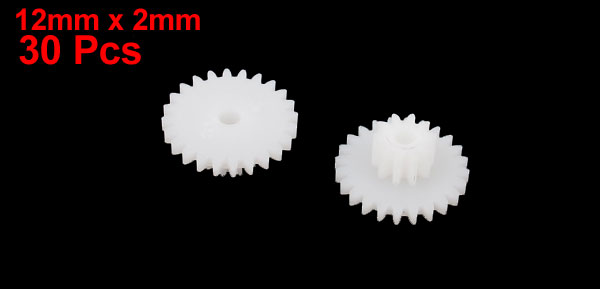 Diameter 12mm/0.5" ;5mm/0.2" Main Color White Fit for for DIY Toys Motor Reduction Box Brand DMiotech Net Weight 9g Country of Manufacture CHINA Package Content 30 Pcs x Plastic Crown Gear Type Double Gear Material Plastic for Shaft Dia 2mm Thickness 5mm/0.2" Teeth Number Big: 24 Small: 9 - Reviews