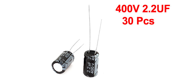 Product Name Electrolytic Capacitor Type Radial Voltage 400V Capacitance 2.2UF Body Size 8 x 12mm/0.31" x 0.47"(D*L) Lead Space 2.5mm/ 0.098" Lead Length 25mm/0.98", 20mm/0.79" Total Length 39mm/ 1.5" External Material Aluminum Total Net Weight 27g Main Color Black, Gray, Silver Tone Package Content 30PCS x Electrolytic Capacitors - Reviews