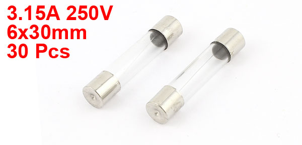 Details30pcs 6x30mm 3.15A 250V Quick Blow Fast Acting Cylindrical Glass Tube Fuse  Product Name Quick Blow Glass Tube Fuses Features Fast Blow(F) Low Breaking Capacity(L) Rated Current 250V Rated Current 3.15A Body Size 6 x 30mm/ 0.24" x 1.2"(D*L) Material Glass, Metal Color Silver Tone, Clear Weight 33g Package 30 x Quick Blow Glass Tube Fuses