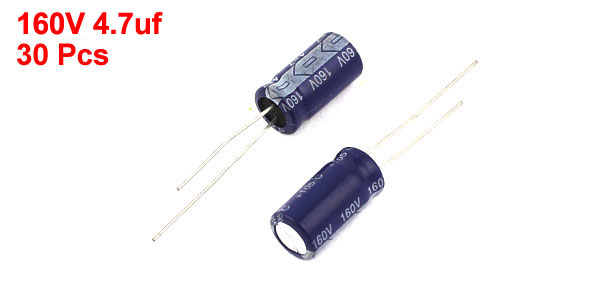 Product Name Electrolytic Capacitor Type Radial Voltage 160V Capacitance 4.7uF Body Size 8 x 15mm/0.32" x 0.59"(D*H) Lead Space 4mm/0.16" External Material Aluminum Total Net Weight 35g Main Color Purple Package Content 30PCS x Electrolytic Capacitors - Reviews