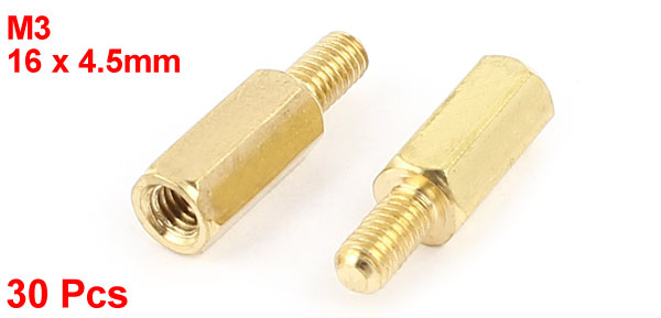 Product Name Standoff Hexagonal Spacer Thread Size M3 Male x M3 Female Male Thread Length 6mm/ 0.24" Body Length 10mm/ 0.39" Total Size(Approx.) 16 x 4.5mm/ 0.6" x 0.06" (L*Max.D) Material Brass Color Gold Tone Net Weight 42g Package Content 30 x Standoff Hexagonal Spacer
