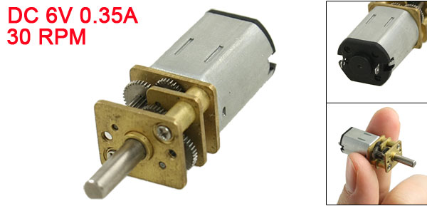 Product Name DC Geared Motor Rated Voltage DC 6V Rated Current 0.35A ( no load ) Speed 30 RPM Shaft Diameter 3mm/ 0.118" Gearbox Size 15 x 12 x 10mm/ 0.59" x 0.47" x 0.39"(L*W*T) Overall Size 36 x 12 x 10mm/ 1.4" x 0.47" x 0.39"(L*W*T) Main Color Silver Tone, Brass Tone Material Metal Weight 10g Package 1 x DC Geared Motor - Reviews