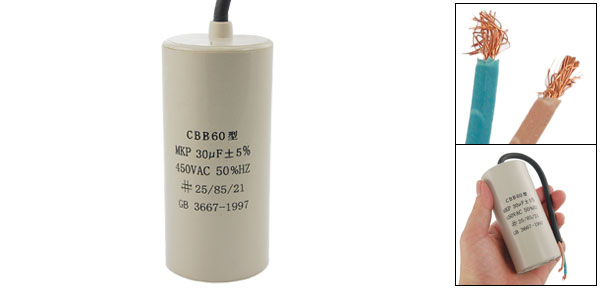 Product Name Motor Capacitor Housing Material Plastic Dielectric Material Metallized Polypropylene Film Model CBB60 Capacitance 30uF Tolerance ±5% Rated Voltage 450VAC Frequency 50Hz Body Size 4.4 x 9.7cm / 1.73" x 3.8" (D * H) Wire Size(Approx.) 17.5 x 0.6cm / 6.8" x 0.23" (L * Max.D) Color As Picture Shown Weight 139g Package Content 1 x Motor Capacitor - Reviews