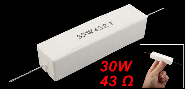 Product Name Cement Resistor Body Material Ceramic, Cement Power 30W Resistance 43Ω Tolerance ±5% Body Size (Approx.) 74 x 18 x 17mm / 2.9" x 0.7" x 0.7" (L * W * H) Pin Size (Approx.) 28 x 1mm / 1.1" x 0.04"(L*D) Color White Weight 56g Package Content 1 x Cement Resistor - Reviews