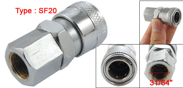 Product Name Air Quick Coupler Type SF20 End Inside Dia 13.8mm / 35/64" Female Thread Dia. 12.3mm / 31/64" Fluid Air Overall Size 45 x 23.8mm / 2.2" x 0.94" (L * Max.D) Color Silver Tone Material Metal Weight 73g Package 1 x Air Quick Coupler - Reviews