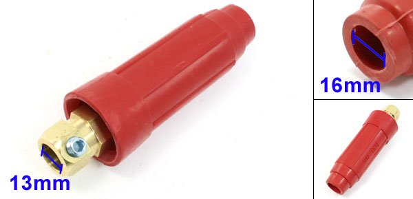 Product Name Welding Connector Model DKJ-35 Current Range 315A Rubber Hole Diameter 16mm/ 0.63", 27mm/1" Metal Inner Dia 13mm/0.51" Overall Size 36 x 115mm/1.4" x 4.5"(Max.D*H) Material Rubber, Metal Main Color Red, Gold Tone