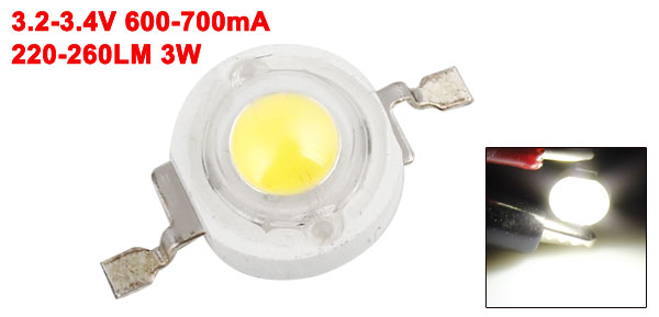 Product Name High Power LED Bead Voltage 3.2-3.4V Current 600-700mA Luminous Flux 220-260LM Color Temperature 6000-6500K Power Consumption 3W Total Size 15 x 8 x 5mm / 0.6" x 0.3" x 0.2" (L*W*H) Emitter Dia 5mm / 0.2" Light Color White Material Aluminum Net Weight 1g Package Content 1 x High Power LED Bead - Reviews