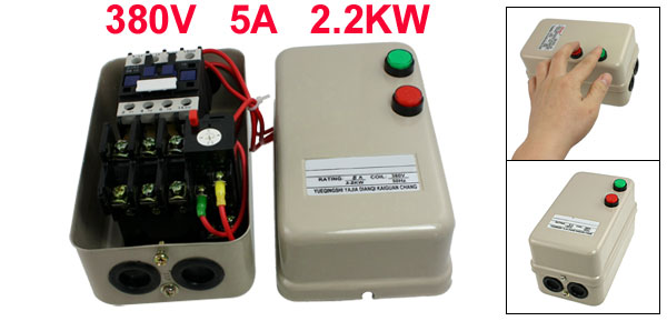 Ie(AC-1):20A AC Contactor Ui:660V Ue 220V 380V 660V AC-3 Ie 9A 9A 6.6A Pe 2.2KW / 3 HP 4KW / 5.36 HP 5.5KW / 7.37 HP Contact:4 NO, 3 Phase Setting Current 3.2-5A Control Box Total Size 160 x 92 x 92mm / 6.3" x 3.6" x 3.6" (L * W * H) Fixing Hole Diameter 5.9mm / 0.23" Fixing Hole Center Distance 140mm / 5.5" Push Button Diameter 15.4mm / 0.6" Box Color Gray Weight 959g Package Content 1 x Motor Magnetic Starter - Reviews