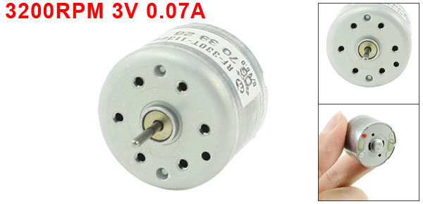 Product Name DC Motor Rated Voltage DC 3V Rated Current 0.07A Speed 3200RPM Mounting Screw Hole Diameter 1mm/0.04" Shaft Size 1.5 x 9mm/ 0.06" x 0.35"(D*L) Body Size 18 x 24mm/ 0.7" x 0.9" (H*D) Main Color Silver Tone External Material Metal, Plastic Net Weight 30g Package 1 x DC Motor - Reviews