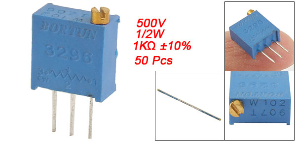 Product Name Cermet Potentiometer Model 3296W-1-102 Quantity 50±2% Pcs Withstand Voltage 500V Rated Power 1/2W Resistance Value 1K Ohm(1,000ohm) Tolerance ±10% Adjustment Tyoe Top Adjustment Mounting Type Through Hole(DIP) Turn Number 25 Resistance Change Type Linear Resistive Material Cermet Temperature Coefficient ±100ppm/°C Square Body Size 9 x 9mm/ 3/8" x 3/8" (L*W)