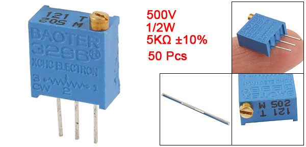 Product Name Cermet Potentiometer Model 3296W-1-502 Quantity 50±2% Pcs Withstand Voltage 500V Rated Power 1/2W Resistance Value 5K Ohm(5,000ohm) Tolerance ±10% Adjustment Tyoe Top Adjustment Mounting Type Through Hole(DIP) Turn Number 25 Resistance Change Type Linear Resistive Material Cermet Temperature Coefficient ±100ppm/°C Square Body Size 9 x 9mm/ 3/8" x 3/8" (L*W)