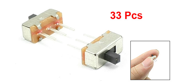 Details33 Pcs 3 Pins ON/ON 2 Positions SPDT Panel PCB Horizontal Slide Switch  Product Name Slide Switch Position 2 Pins Design 3 Pins Contact Type SPDT Pins Pitch 1.5mm/ 0.06" Rating DC 50V, 0.5A Contacts Resistance 30MΩ Insulation Resistance 100MΩ Minimum Load DC 500V Dielectric Strengths AC 500V / 1 minute Life Test 10000 cycles/ minute Overall Size 8.5 x 3.8 x 11mm/ 0.3" x 0.15" x 0.4" (L*W*H) Material Plastic, Metal Color Black, Silver Tone Weight 10g Package 33 x Horizontal Slide Switch