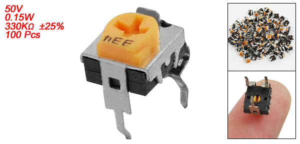 Details330K Ohm 334 Variable Resistor Trimmer Potentiometer 100 Pcs  Product Name Variable Resistor Trimmer Potentiometer Max. Operating Voltage 50V Power Rating 0.15W Resistance Value 330K Ohm Resistance Tolerance ±25% Mounting Type Through Hole (DIP) Resistive Material Carbon Film Square Body Size 6.8 x 6.8mm / 0.27" x 0.27" (L*W) Pin Size (Each) 0.8 x 8.5mm / 0.03" x 0.33" (W*L) Pin Pitch 4 x 5mm / 0.16" x 0.2" Color As Picture Shown Weight 39g Package Content 100 (±2%) x Variable Resistors Trimmer Potentiometers