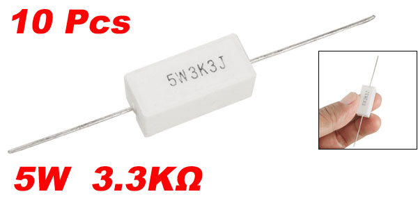 Product Name Cement Resistor Body Material Ceramic, Cement Power 5W Resistance 3.3KΩ Tolerance ±5% (J) Body Size (Approx.) 22 x 9 x 9mm/0.86" x 0.35" x 0.35" (L * W * H) Lead Diameter (Approx.) 0.8mm/0.031" Color White Weight 48g Package Content 10 x Cement Resistors - Reviews