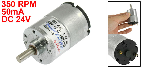Product Name Gear Motor Rated Voltage DC 24V Rated Current 50mA Rated Torque 0.37Kg.cm Rated Speed 350 RPM Shaft Size 15 x 6mm/0.6" x 0.24" (L*D) Motor Body Length 43mm/1.7" Motor Body Diameter 33mm/1.3" Thread Diameter 2.5mm/0.1" Total Length(Included Pin) 69mm/2.7" Material Metal, Electronic Parts Color Silver Tone Weight 114g Package Content 1 x Gear Motor - Reviews