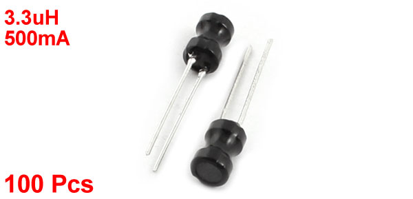 Product Name Radial Lead Inductor Inductance 3.3uH Rating Current 500mA Tolerance 10% Body Size 4 x 6mm / 0.16" x 0.24"(D*H) Pin Size 0.5 x 14mm/ 0.2" x 0.55"(D*L) Lead Distance 2mm / 0.08" Color Black, Silver Tone Weight 30g Package Content 100Pcs(±2%) x Radial Lead Inductor - Reviews