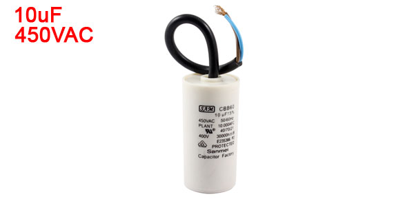 Product Name Motor Capacitor Housing Material Plastic Dielectric Material Polypropylene Model CBB60 Capacitance 10uF Tolerance ±5% Rated Voltage 450VAC Frequency 50/60Hz Body Size 3.44 x 6.9cm / 1.35" x 2.7" (D * H) Wire Size(Approx.) 16.5 x 0.6cm / 6.5" x 0.24" (L * Max.D) Color White, Black ,Blue,Brown Weight 63g Package Content 1 x Motor Capacitor - Reviews