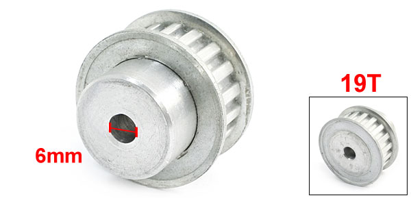 Product Name Timing Pulley Material Aluminum Color Silver Tone Number of Tooth 19T Pitch 5.08mm/1/5'' Bore Diameter 6mm/0.24" Top Diameter 21mm/0.8" Overall Size 34 x 25mm/1.4'' x1''(D*H) Fit Belt Width 11mm/0.43" Weight 44g Package Content 1 x Timing Pulley - Reviews