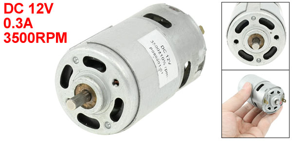 Details3500RPM 12V 0.3A High Torque Cylinder Magnetic Electric Mini DC Motor  Product Name DC Motor Rated Voltage Current DC 12V 0.3A Speed 3500RPM Mounting Screw Hole Diameter 3.5mm/0.1" Screw Hole Center Distance 29mm/1" Knurled Shaft Size 5 x 10mm/ 0.2" x 0.4"(D*L) Body Size 44 x 66mm/ 1.7" x 2.6" (D*H) Main Color Silver Tone Material Metal Net Weight 343g Package 1 x DC Motor