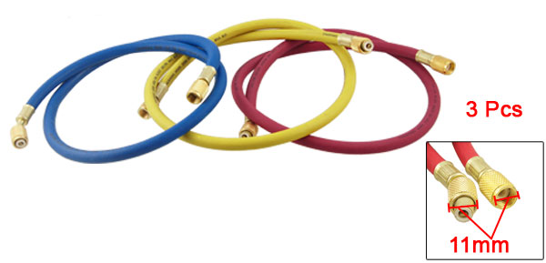 Product Name Refrigeration Charging Hoses Working Pressure 500PSI Burst Pressure 2500PSI Female Diameter 11mm/0.43" Total Size 90x 1.1cm/ 35" x 0.43"(L*Dia.) Color Red, Blue, Yellow Material Plastic, Brass Weight 380g Package 3 x Refrigeration Charging Hoses - Reviews
