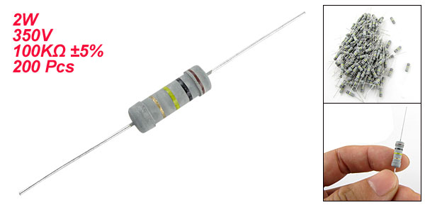 Product Name Carbon Film Resistors Material Type Carbon Film Rated Power 2W Resistance Value 100K ohm Tolerance ±5% Withstand Voltage 350V Total Size 59 x 5mm / 2.322" x 0.196" (L * D) Lead Diameter 0.4mm / 0.0157" Color As Picture Shown Weight 166g Package Content 200 Pcs (± 2%) x Carbon Film Resistors - Reviews