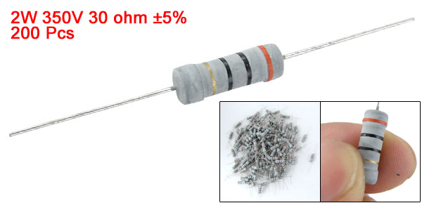 Product Name Carbon Film Resistors Material Type Carbon Film Rated Power 2W Resistance Value 30 ohm Tolerance ±5% Withstand Voltage 350V Total Size 59 x 5mm / 2.322" x 0.196" (L * D) Lead Diameter 0.4mm / 0.0157" Color As Picture Shown Weight 170g Package Content 200 Pcs (± 2%) x Carbon Film Resistors - Reviews