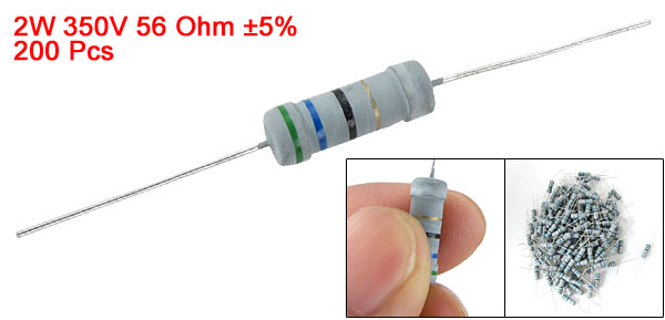 Product Name Carbon Film Resistors Material Type Carbon Film Rated Power 2W Resistance Value 56ohm Tolerance ±5% Withstand Voltage 350V Total Size 59 x 5mm / 2.322" x 0.196" (L * D) Lead Diameter 0.4mm / 0.0157" Color As Picture Shown Weight 157g Package Content 200 Pcs (± 2%) x Carbon Film Resistors - Reviews