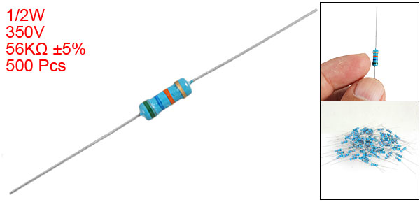 Product Name Carbon Film Resistor Lead Type Axial Power Rating 1/2W Resistance Tolerance ± 5% Resistance Value 56K Ohm Withstand Voltage 350V Size (Not Include Leads) 0.3 x 0.85cm / 0.12" x 0.33" (D*L) Leads Dia (Approx.) 0.03cm / 0.012" Total Length (Approx.) 5.6cm / 2.2" Color As Picture Show Weight 123g Package Content 500 Pcs (± 2%) x Carbon Film Resistors - Reviews