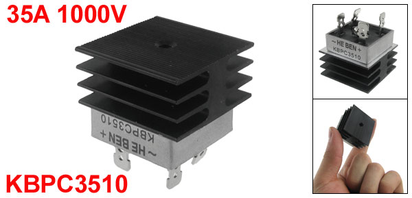 Product Name Single Phase Bridge Rectifier with Heatsink Model No. KBPC3510 Output Current(DC) 35A Repetitive Peak Reverse Voltage(AC) 1000V Repetitive Peak Reverse Current 5mA Insulation Voltage 2500V Overall Size(Approx.) 34 x 34 x 38mm / 1.3" x 1.3" x 1.5"(L*W*H) Material Metal, Plastic Net Weight 44g Package Content 1 x Single Phase Bridge Rectifier with Heatsink - Reviews