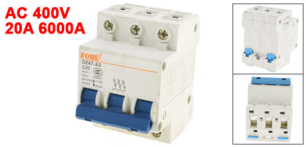 Product Name Circuit Breaker Model No. DZ47-63 C20 Material Plastic, Electric Components Main Color White, Blue Rated Voltage AC 400V Rated Current 20A Breaking Capacity 6000A Total Size (Approx.) 7.7 x 5.4 x 7.4cm / 3" x 2.1" x 2.9"(L*W*H) Number of Poles 3 Mount Type 3.5cm DIN Rail Weight 254g Package Content 1 x Circuit Breaker - Reviews
