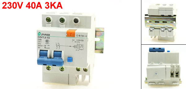 Product Name Circuit Breaker Model DZ47LE-63 C40 Rated Voltage 230V Rated Current 40A Rated Circuit Breaking Capacity 3kA Frequency 50Hz Mounting Type 35mm DIN Rail Mount Body Size (Approx.) 9.3 x 7.5 x 6.3cm/3.6" x 3" x 2.5"(L * W * H) Lead Rail Size 7.8 x 3.5 x 0.6cm/3.1" x 1.4" x 0.24"(L*W*H) Number of Poles 2 Material Plastic, Electric Components Color Gray, Blue Weight 274g Package Content 1 x Circuit Breaker