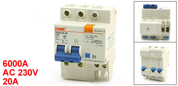 Product Name Circuit Breaker Model Number DZ47LE-32 C20 Rated Circuit Breaking Capacity 6000A Rated Voltage AC 230V Rated Current 20A Frequency 50Hz Poles 2 Pole Mounting Type 35mm DIN Rail Mount Overall Size (Approx) 90 x 65 x 63mm/3.5" x 2.6" x 2.5"(L*W*H ) Material Plastic, Electric Components Color As Picture Shown Weight 377g Package Content 1 x Circuit Breaker