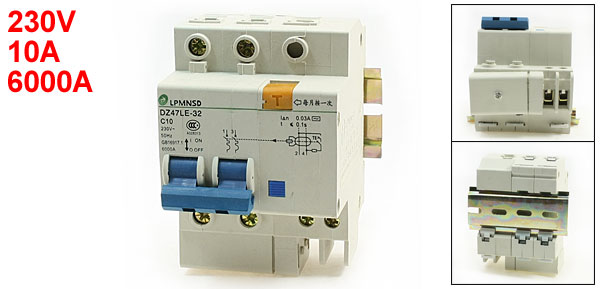 Product Name Circuit Breaker Model DZ47LE-32 C10 Rated Voltage 230V Rated Current 10A Rated Circuit Breaking Capacity 6000A Frequency 50Hz Mounting Type 35mm DIN Rail Mount Body Size (Approx.) 9.3 x 7.5 x 6.3cm/3.6" x 3" x 2.5"(L * W * H) Lead Rail Size 7.8 x 3.5 x 0.6cm/3.1" x 1.4" x 0.24"(L*W*H) Number of Poles 2 Material Plastic, Electric Components Color Gray, Blue Weight 274g Package Content 1 x Circuit Breaker
