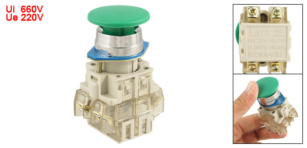 Product Name Push Button Switch Model LAY3-11M Contact Type 1 NO(Normally Open) + 1 NC(Normally Close) Action Type Momentary Ith 10A Ui 660V Ie 4.5A Ue 220V Panel Cutout Diameter 2.2cm / 0.87"(7/8") Fit Panel Thickness(Adjustable) Max 0.8cm / 0.3" Button Diameter 3.5cm / 1.378" Total Size 4.6 x 3.2 x 7.3cm / 1.81'' x 1.26'' x 2.87'' (L*W*H) Main Material Plastic, Metal Main Color Green, Blue Weight 52g Package Content 1 x Push Button Switch - Reviews