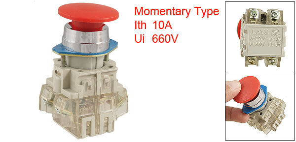 Product Name Push Button Switch Model LAY3-11M Action Type Momentary Contact Type 1 NO(Normally Open) + 1 NC(Normally Close) Ith 10A Ui 660V Ie 4.5A Ue 220V Panel Cutout Diameter 2.2cm / 0.87"(7/8") Fit Panel Thickness(Adjustable) Max 0.8cm / 0.3" Button Diameter 3.5cm / 1.378" Total Size 4.6 x 3.2 x 7.3cm / 1.81'' x 1.26'' x 2.87'' (L*W*H) Main Material Plastic, Metal Main Color Red, Blue Weight 52g Package Content 1 x Push Button Switch - Reviews